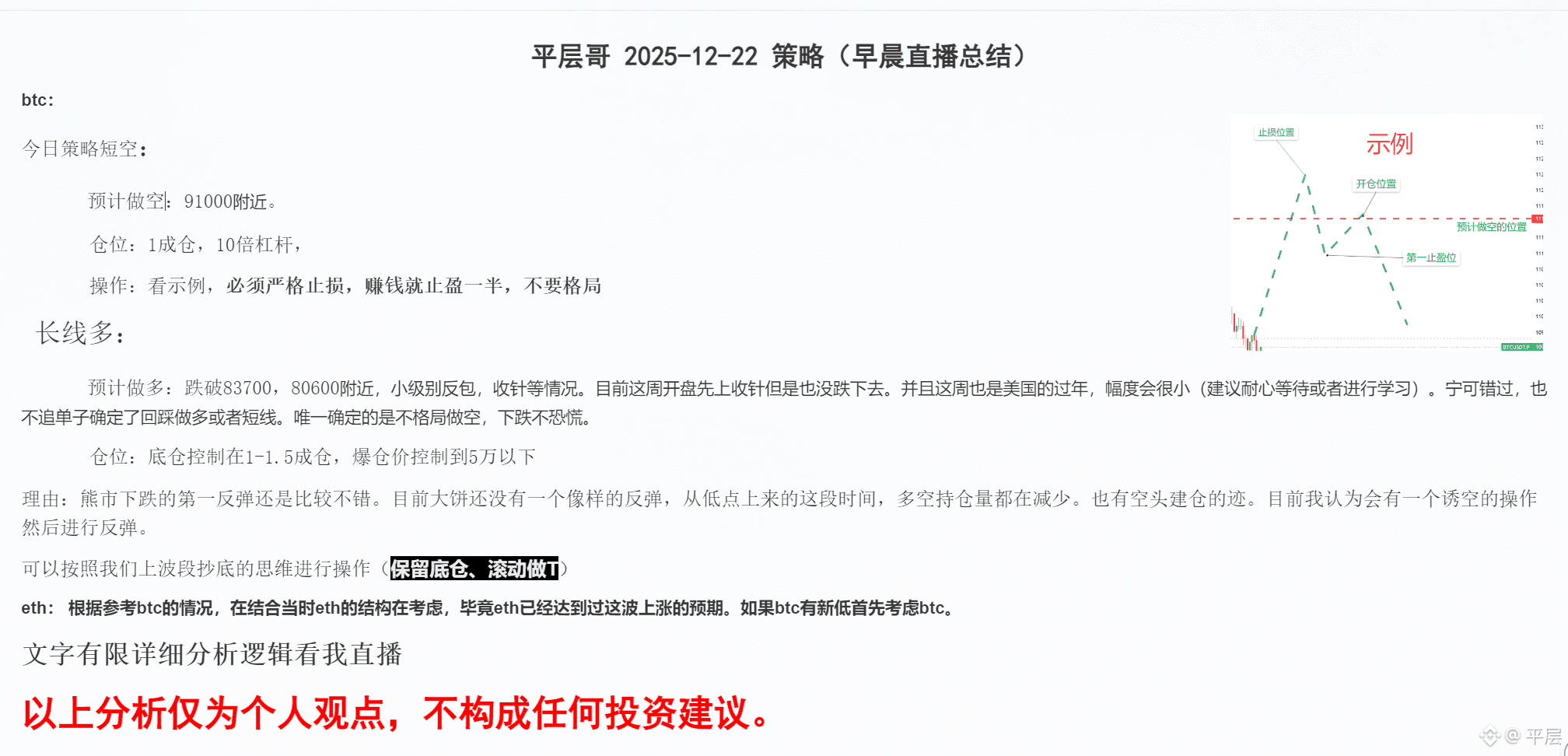 12月22日在91000附近提示短空机会,必须严格止损,赚钱就止盈一半,不要格局。