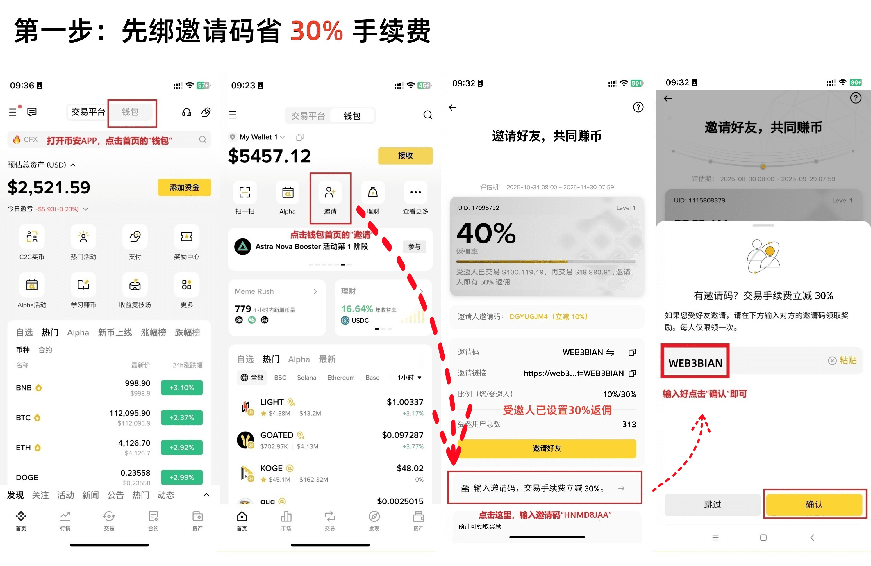 Nota: effettuare operazioni sulla versione web della Binance Wallet comporta il pagamento di commissioni, ma puoi inserire un codice di invito per ridurre le commissioni. Puoi inserire il mio codice di invito: ZG666, che attualmente offre uno sconto automatico del 30% sulle commissioni. Potrai risparmiare qualcosa durante il trading. Puoi collegarlo direttamente dall'app, ecco il flusso operativo.