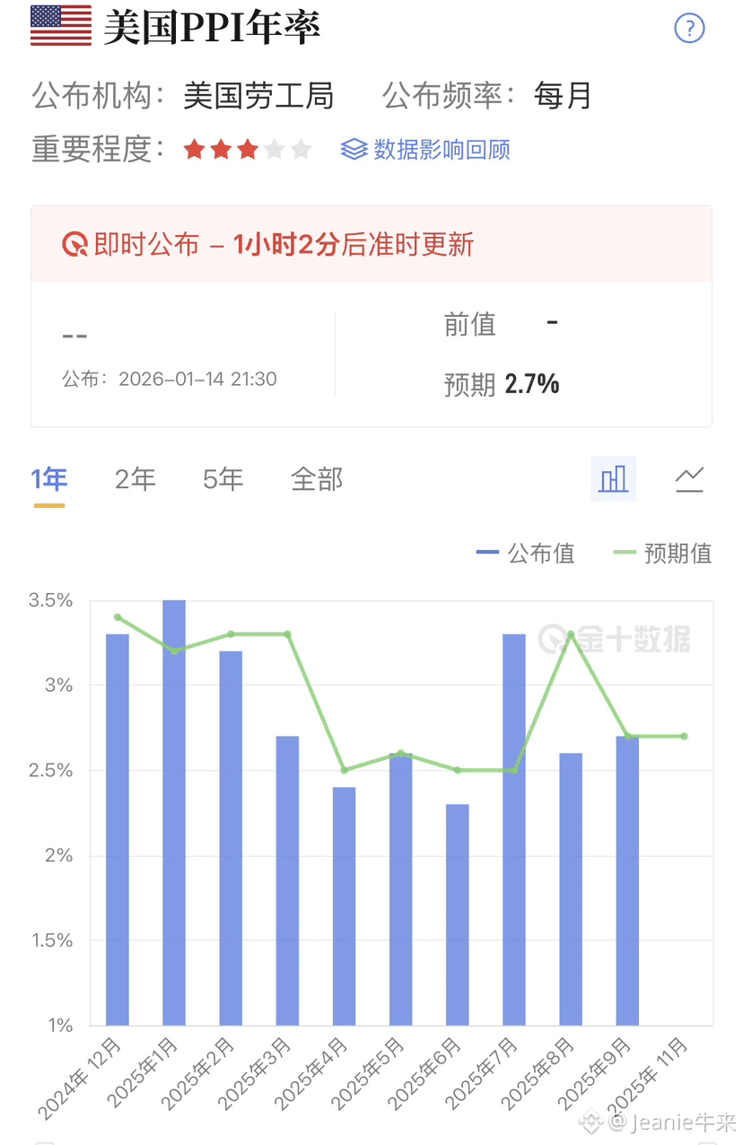 美国11月PPI年率今天终于要落地了,实际公布值正好卡在2.7%的预期线上,一分不差。这份数据来得有点晚(受政府关门影响推迟),但市场等的就是这个“稳”字。PPI作为通胀的先行指标,上游价格稳住没乱跑,基本告诉大家:供应链的压力没进一步失控,美联储的降息路径暂时不用太慌。高于预期的话,鹰派声音会瞬间放大,利率预期上行,比特币、以太坊这些风险资产大概率要吃2-4%的回调,资金瞬间逃向安全资产,股市crypto双杀的戏码又要上演。毕竟,谁敢在通胀抬头的时候还敢重仓高贝塔?反过来,如果低于预期,哪怕只是2.5%,那市场会像打了鸡血一样解读成“通胀彻底凉了,降息加速来临”。资金会蜂拥进风险市场,加密市场短期轻松拉2-4%,甚至更高,因为低利率+流动性宽松的环境,对比特币这种“数字黄金”简直是天赐良机。