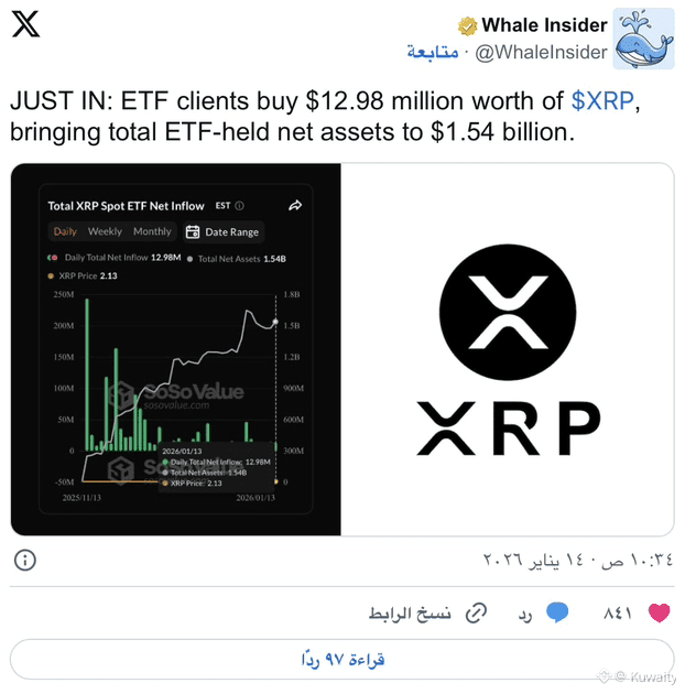 تشهد صناديق تداول $XRP الفورية طلبًا قويًا مرة أخرى. في 13 يناير، أضاف المستثمرون 12.98 مليون دولار إلى صناديق XRP الفورية. وفقًا لبيانات SoSoValue، دفع هذا إجمالي الأصول المحتفظ بها في الصناديق إلى حوالي 1.54 مليار دولار. ويشكل هذا يومًا أخضر آخر ضمن سلسلة طويلة من التدفقات الداخلة.