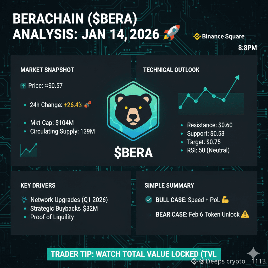 * Key Resistance: The immediate hurdle is $0.60. If BERA can close a daily candle above this, the next target is $0.75.