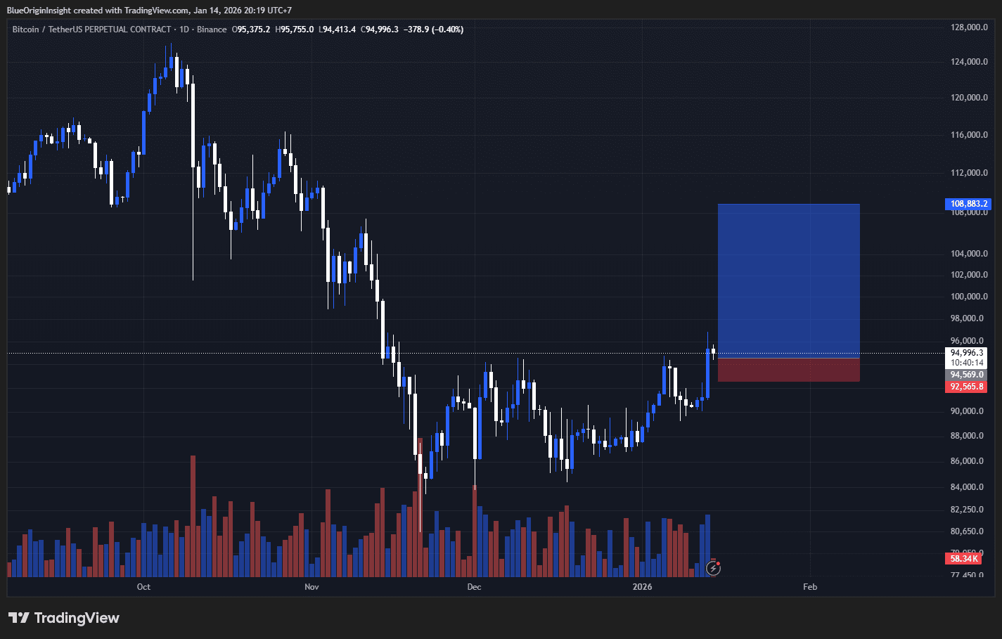 Dopo il forte ribasso verso la fine dell'anno, $BTC d non si è limitato a trovare un fondo, ma ha costruito un minimo più alto e ha ripreso la zona chiave di resistenza $94K–$95K.