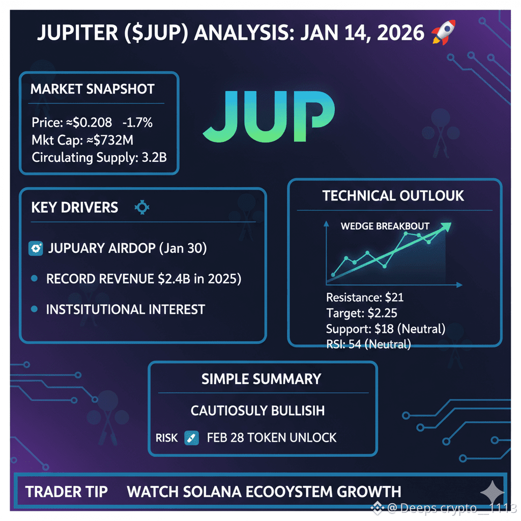 * The "Wedge" Breakout: Analysts are spotting a "Falling Wedge" breakout on the daily chart. If JUP can flip the $0.21 resistance into support, the next target is a quick move toward $0.25.