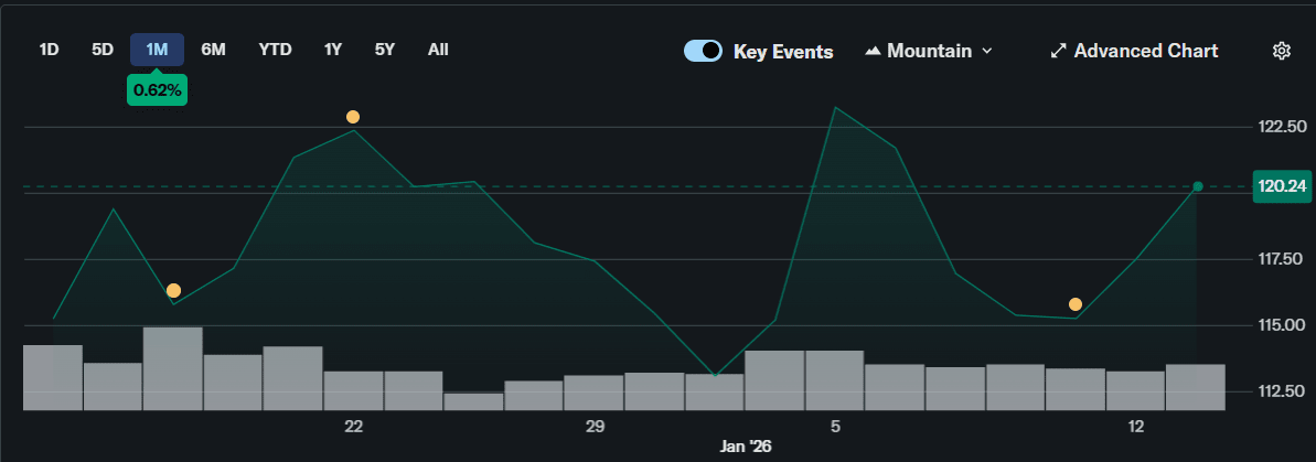 Il prezzo attuale del #HOOD titolo è $119.71, mostrando un guadagno del 3.2% rispetto al minimo giornaliero di $116.00. Durante la giornata, le azioni hanno raggiunto un massimo di $121.57.