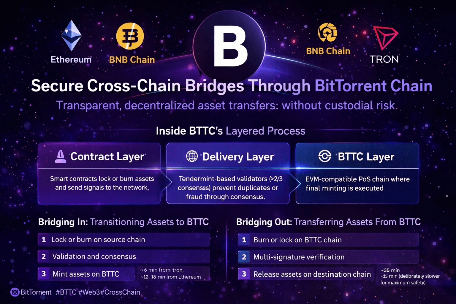 BTTC) è stato progettato per rendere il movimento degli asset tra , , e verificabile, decentralizzato e resistente alla manipolazione, senza dipendere dalla fiducia di un custode.