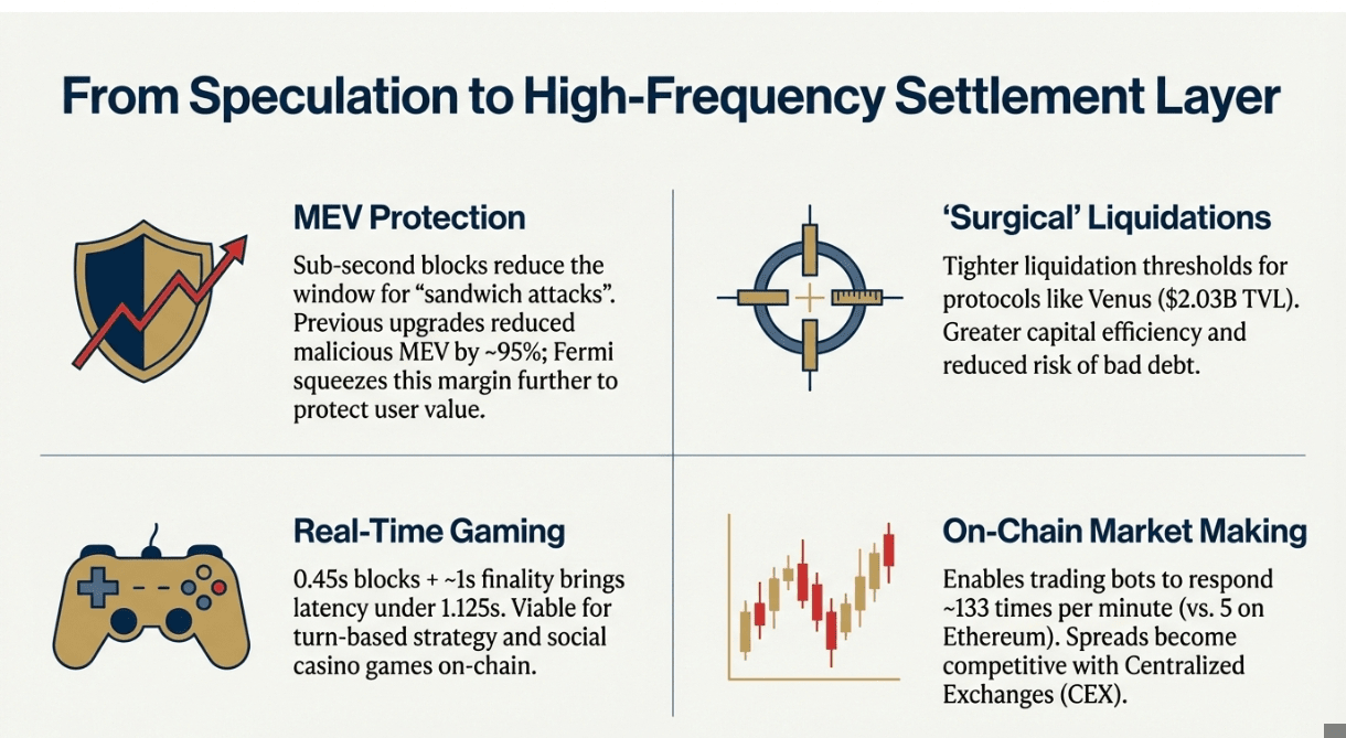 Il protocollo Venus, con 2,03 miliardi di dollari in TVL, può implementare soglie di liquidazione più strette grazie ai tempi di blocco più rapidi. Quando i valori del collaterale calano rapidamente, la rete deve eseguire le liquidazioni prima che le posizioni diventino sottocollaterali. I blocchi più veloci consentono un timing più preciso, permettendo agli utenti di Venus di guadagnare fino al 10,33% di APY su depositi in stablecoin con un'efficienza del capitale migliorata.