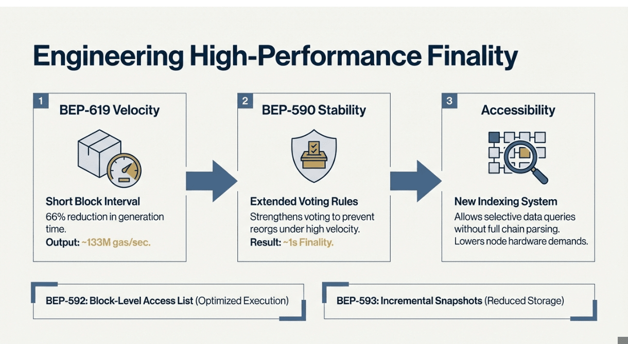 Ciò che distingue Fermi dagli aggiornamenti di rete tipici è l'ampiezza del cambiamento. La rete elabora ora le transazioni con un tempo di finalità di circa 1,125 secondi, il che significa che le transazioni raggiungono l'irreversibilità più velocemente rispetto alla maggior parte dei concorrenti proof-of-stake. BSC elabora attualmente 133 milioni di gas al secondo, con il piano strategico che punta a 1 gigagas al secondo man mano che l'ecosistema cresce.