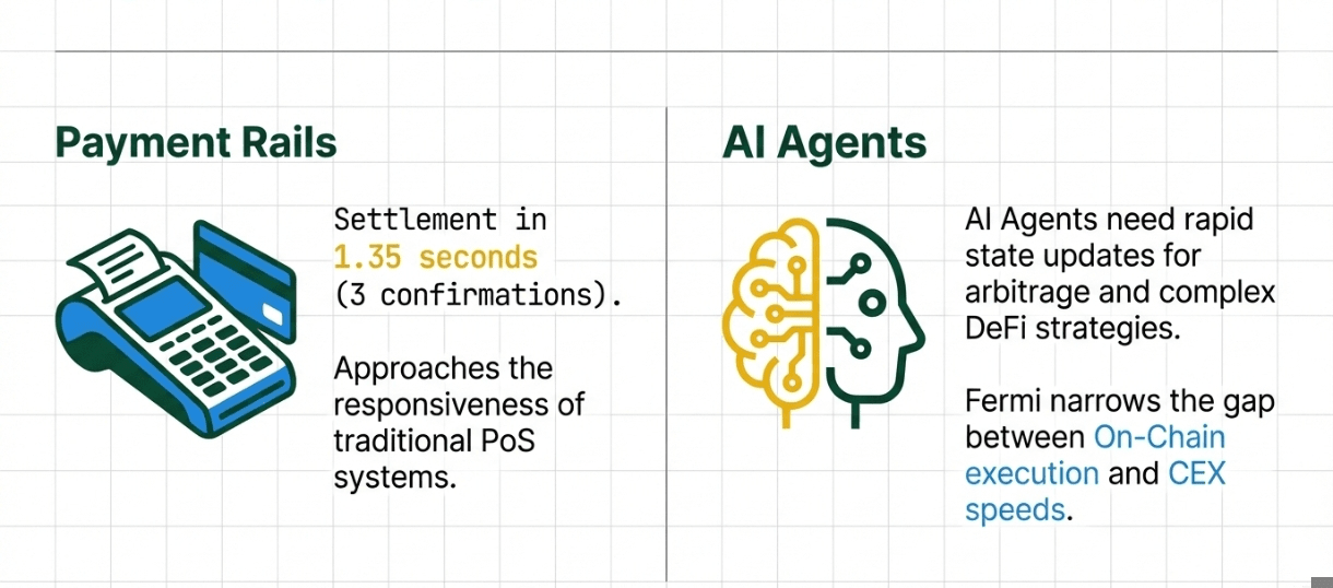 I sistemi di pagamento, i ponti tra catene e i market maker automatizzati traggono vantaggio da tempi di conferma ridotti. Una transazione che richiedeva precedentemente 2,25 secondi per tre conferme di blocco ora si completa in 1,35 secondi. Per i processatori di pagamento che puntano a scenari di punto vendita o trasferimenti internazionali, questo si avvicina alla reattività delle reti di pagamento tradizionali.