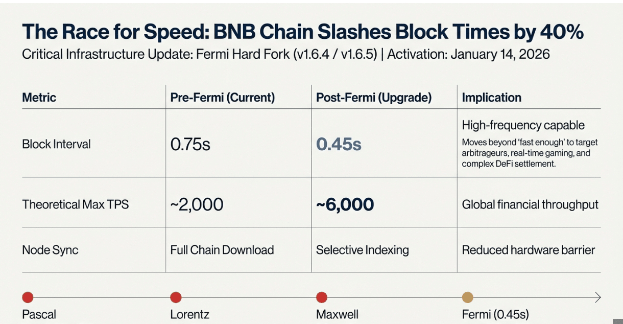 BNB Smart Chain ha appena realizzato qualcosa che la maggior parte delle blockchain menziona solo a parole. Il 14 gennaio 2026, alle 02:30 UTC, è entrato in vigore il hard fork Fermi, riducendo i tempi dei blocchi a 0,45 secondi. Ciò rende BSC una delle catene EVM compatibili più veloci esistenti.