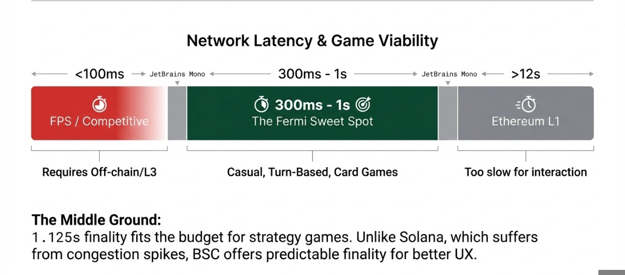 Fermi crea una nuova categoria di gaming blockchain Layer 1 praticabile. La finalità di 1,125 secondi rientra nel budget di latenza per giochi casuali e a turni. I giochi competitivi richiedono tipicamente una latenza round-trip inferiore a 100 millisecondi, mentre i giochi casuali tollerano fino a 300 millisecondi prima di risultare poco reattivi.