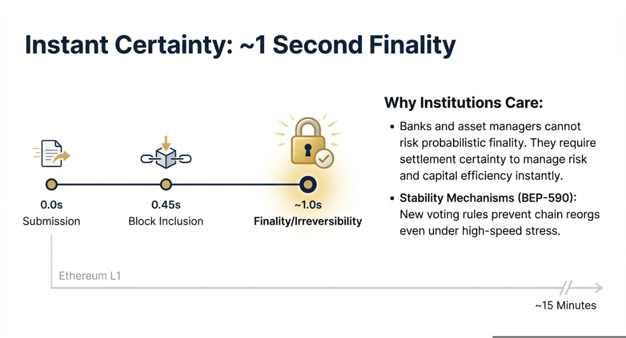 Una finalità veloce significa che le transazioni diventano irreversibili in pochi secondi invece che in minuti. Ethereum L1 richiede da 12 a 15 minuti per la finalità, creando finestre di rischio significative per transazioni ad alto valore. Avalanche raggiunge una finalità di 2 secondi a costo di una capacità inferiore. BSC ora offre una finalità sottosecondo mantenendo un'alta capacità di transazioni e compatibilità con EVM.