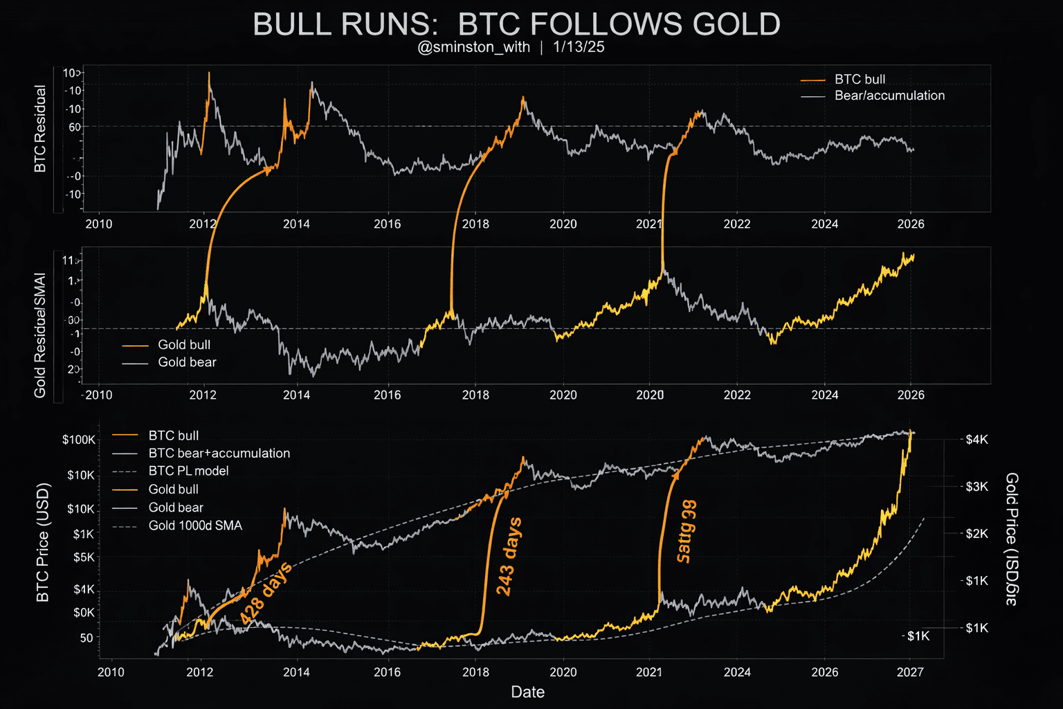 Dopo che l'oro entra in un trend rialzista, il BTC ha bisogno di circa 200-250 giorni per accumulare