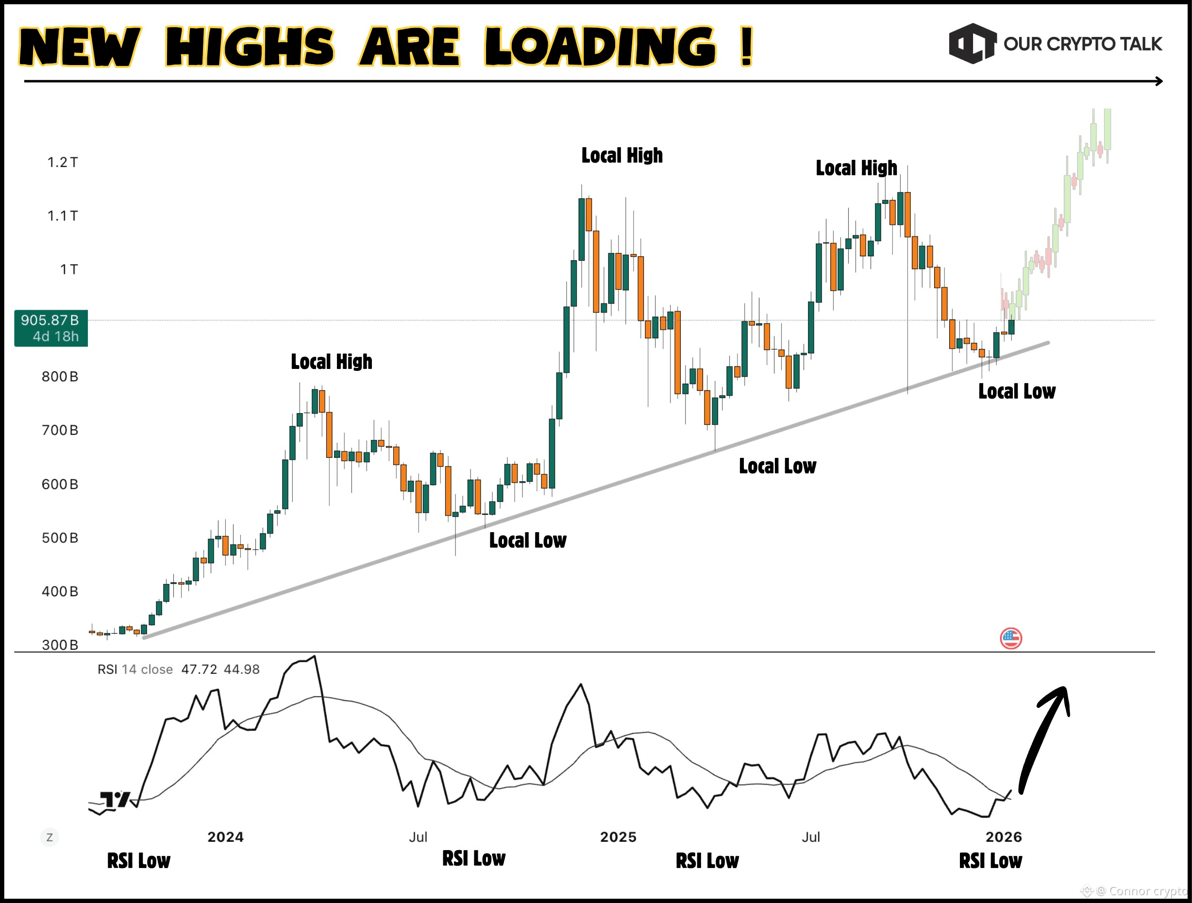 Every time RSI reached these low zones in the past, it didn’t signal the end of the trend. It signaled fuel being reloaded. Each RSI reset was followed by a strong expansion phase in Total3.