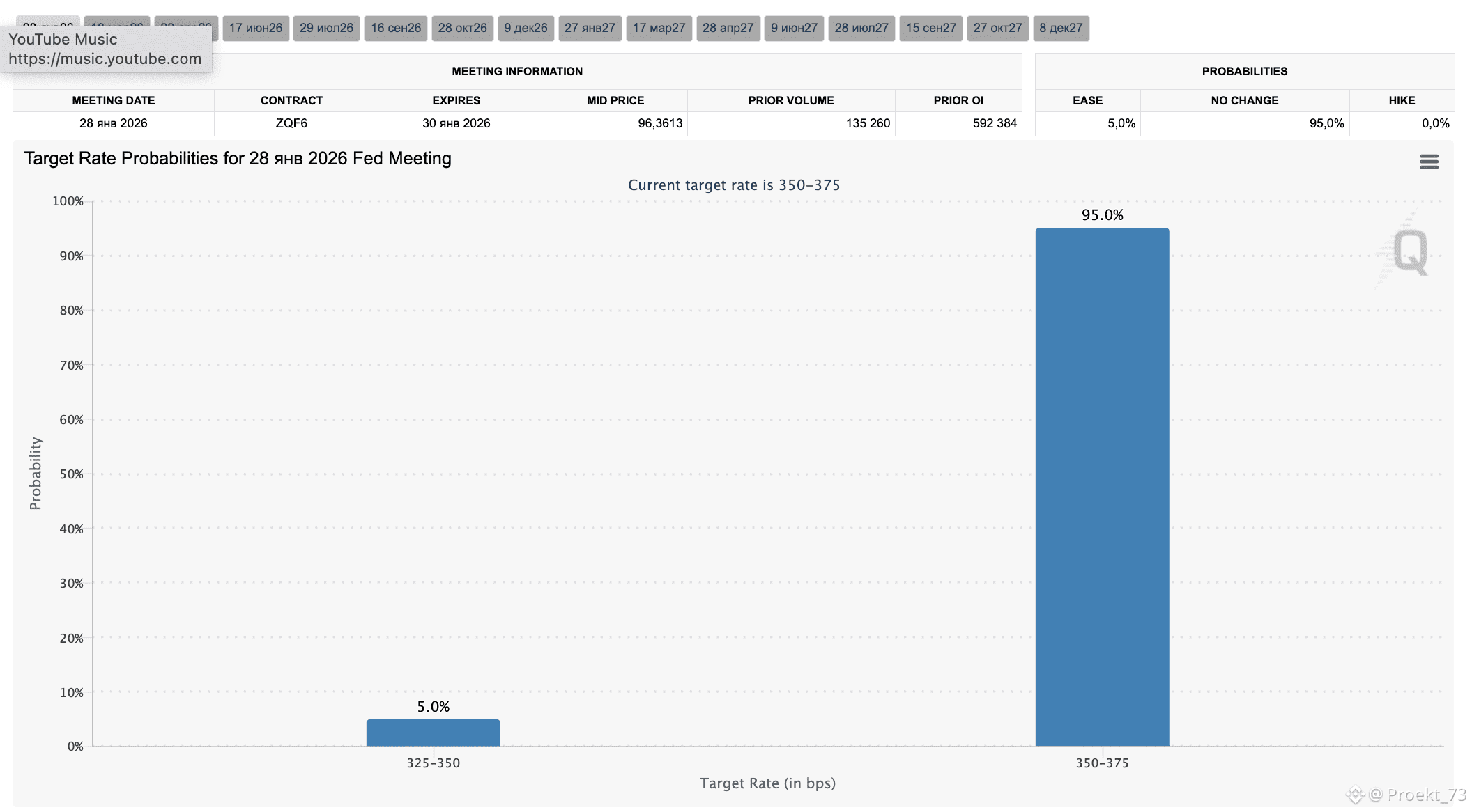 Посмотрим, каким будет решение ФРС США на январском заседании. Оно, напомним, состоится 28 января, через две недели. Пока почти полный консенсус - пауза по процентной ставке. 95% игроков, согласно данным #CMEGroup, ставят на паузу. 5% ждут снижения на 0,25 процентных пункта.