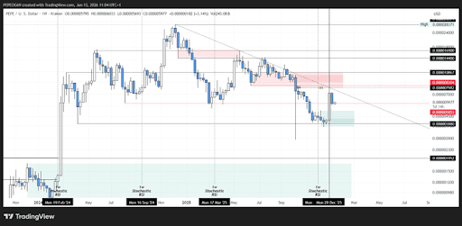 La cosa più folle di tutte è il paragone che stanno facendo con quanto accaduto nel 2023. Analisti come StudyE stanno osservando un pattern che potrebbe ripetersi: se riusciamo a toccare un massimo storico tra domani 15 gennaio e il 15 febbraio, potremmo entrare in una fase parabolica. Per darti un'idea, PEPE ha già iniziato il 2026 con un rialzo del 30% in appena due settimane, e oggi stesso è schizzato del 14%, raggiungendo i $0.000006670. 📈
