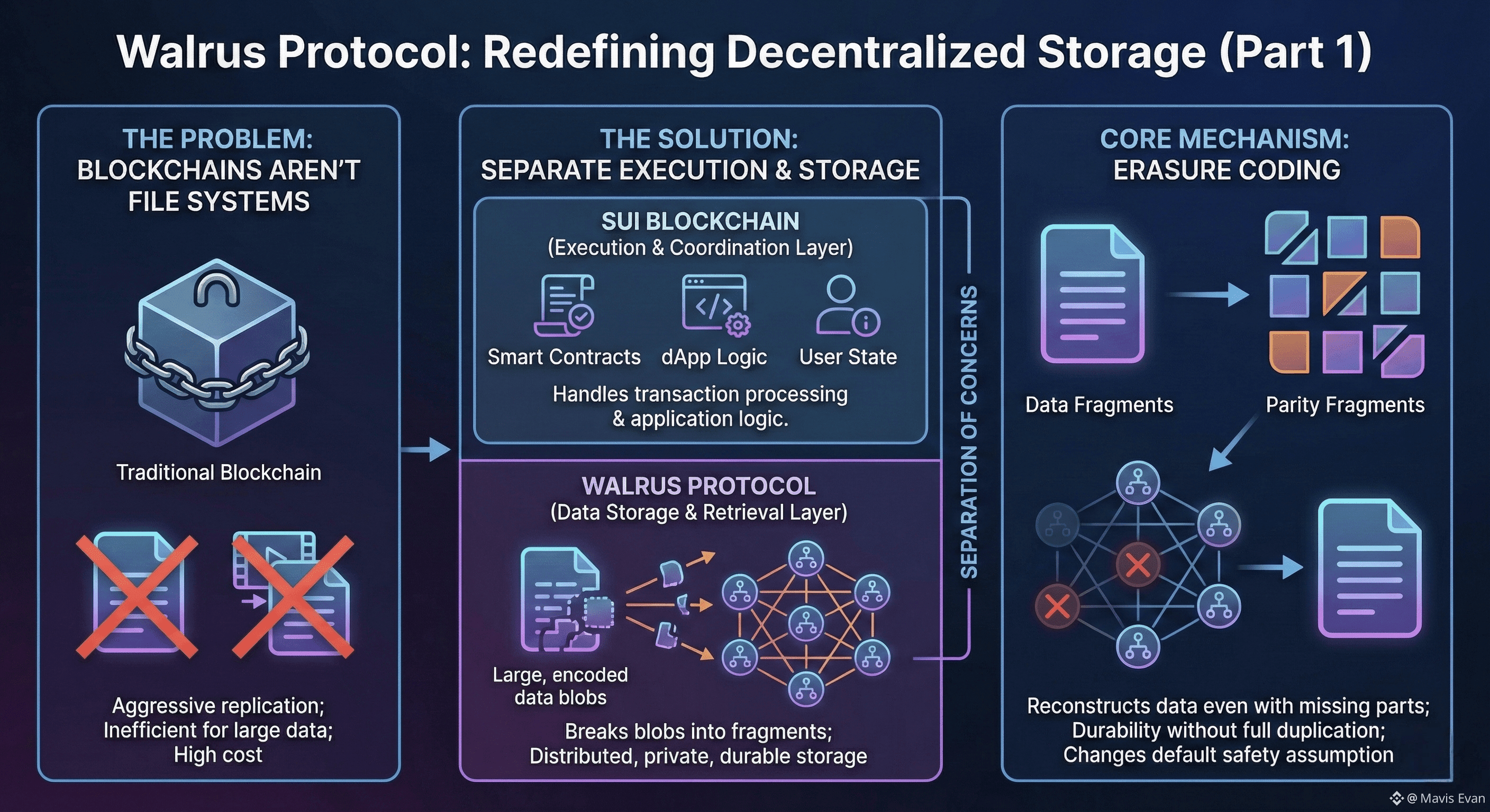 Decentralized systems have become very good at moving value, but they still struggle with something more basic: storing large amounts of data in a way that is private, durable, and economically rational. Blockchains were never designed to be file systems. They replicate state aggressively, which keeps networks honest but makes them painfully inefficient for anything beyond small records. Walrus exists to address that mismatch by separating the idea of data availability from the idea of global replication.
