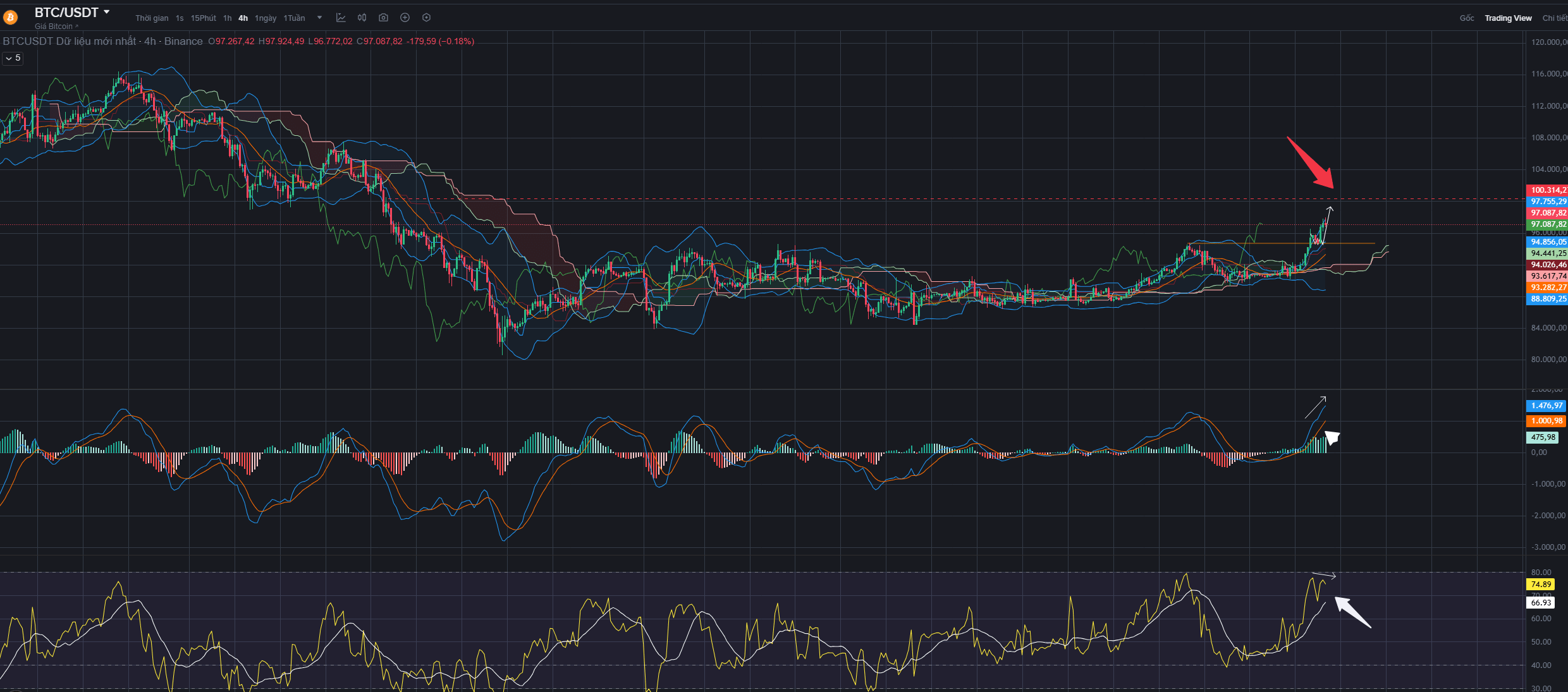MACD ha tagliato fortemente verso l'alto, attualmente si curva leggermente verso il basso → se si osserva nel quadro 1h, ci si trova in una fase di leggera correzione. Tuttavia, se si passa al quadro 4h, si pensa che il TP1: 99.000$ rappresenti un punto di correzione, coerente con il TP1. Pertanto, la priorità attuale rimane il LONG.