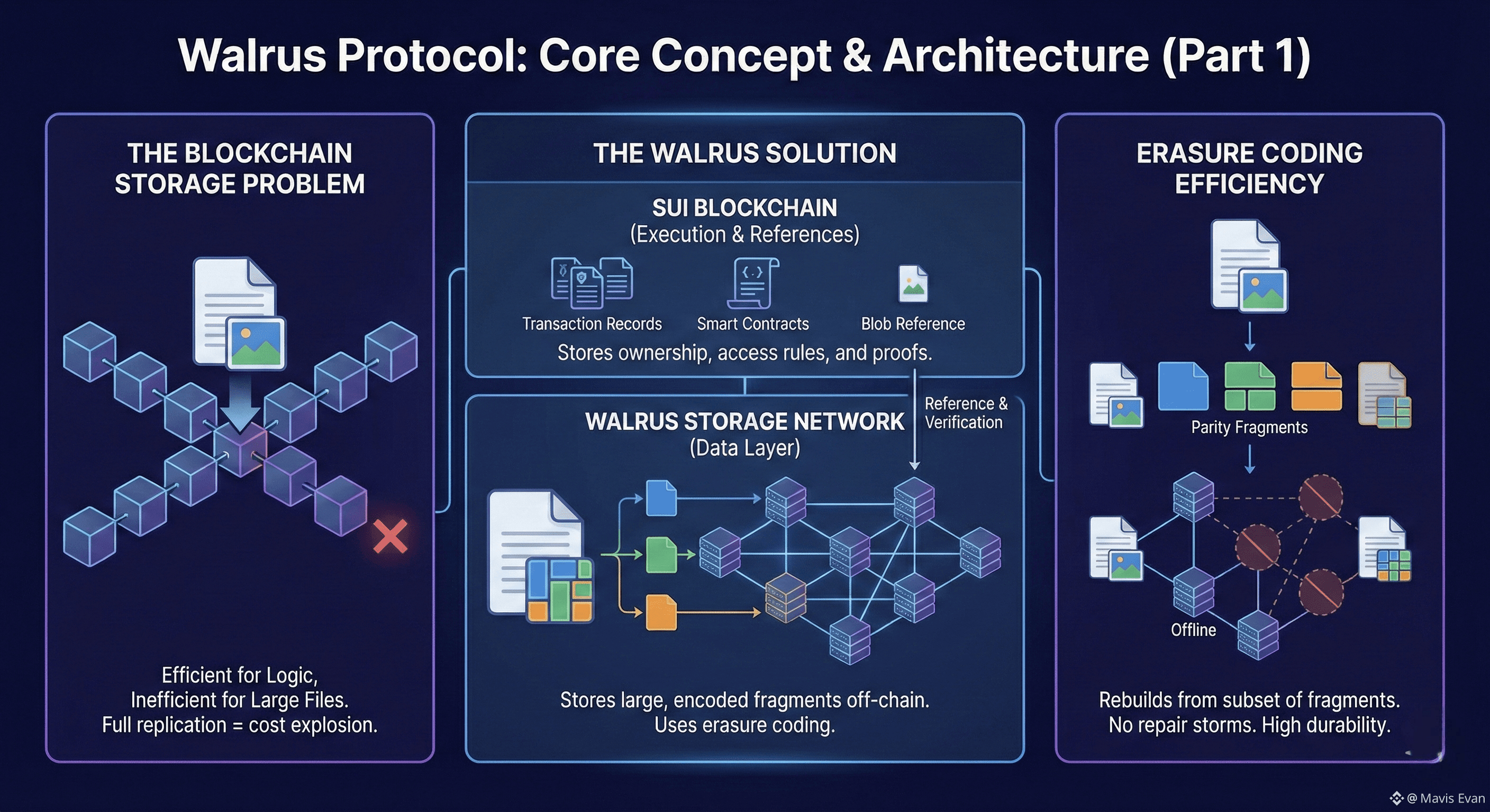 The core idea behind Walrus is that not all data belongs on a blockchain, but ownership and access rules often do. The protocol separates data blobs from the transaction ledger. A blob can be any large binary object, from a PDF to a database snapshot. Instead of writing this blob to the chain, Walrus encodes it and spreads it across a network of storage providers. The blockchain only keeps the references and proof data needed to find and verify the blob later.