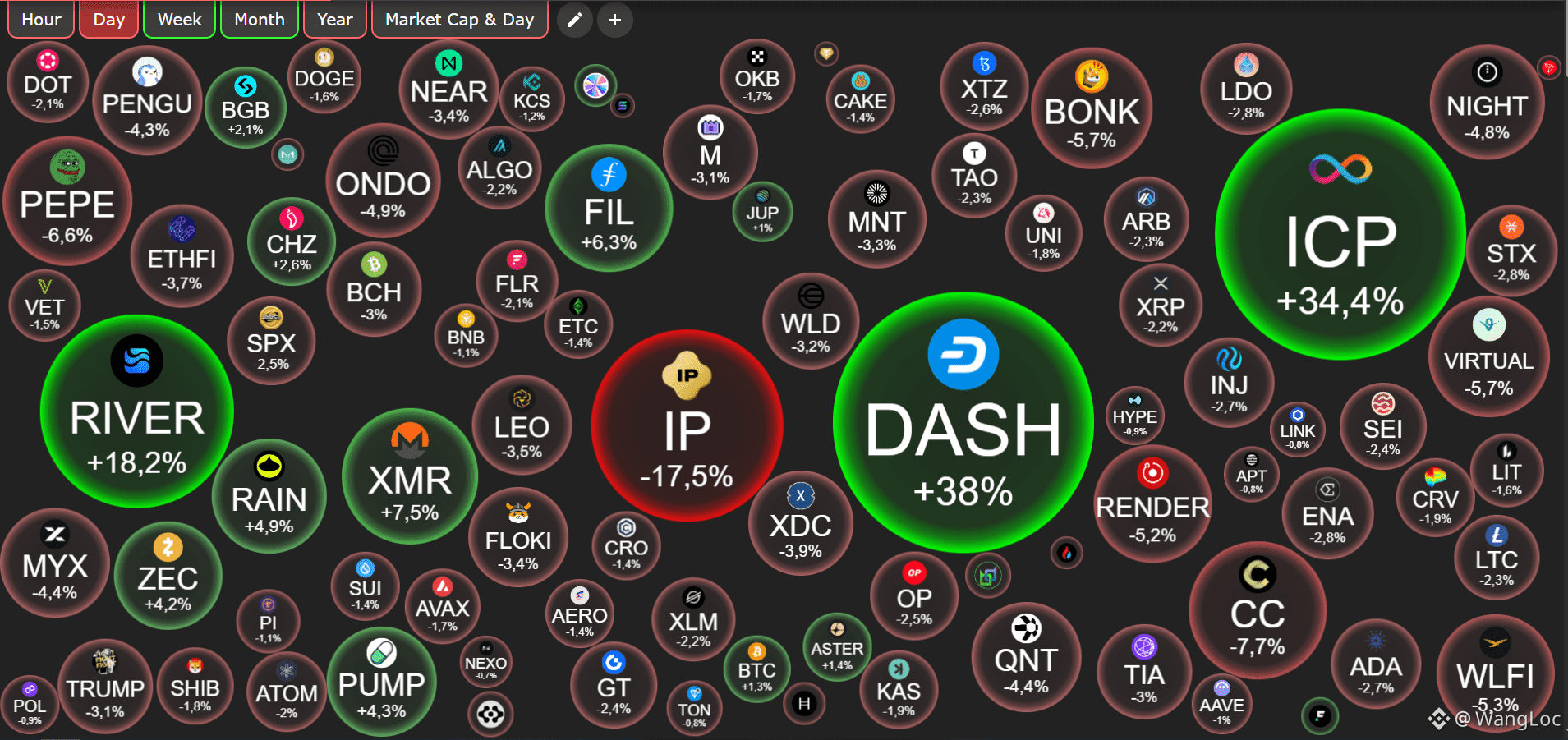 The market isn’t broadly green and that’s the key point. While many alts are flat or slightly red, capital is flowing aggressively into a few selected names: $DASH , $ICP , $RIVER , XMR, FIL.