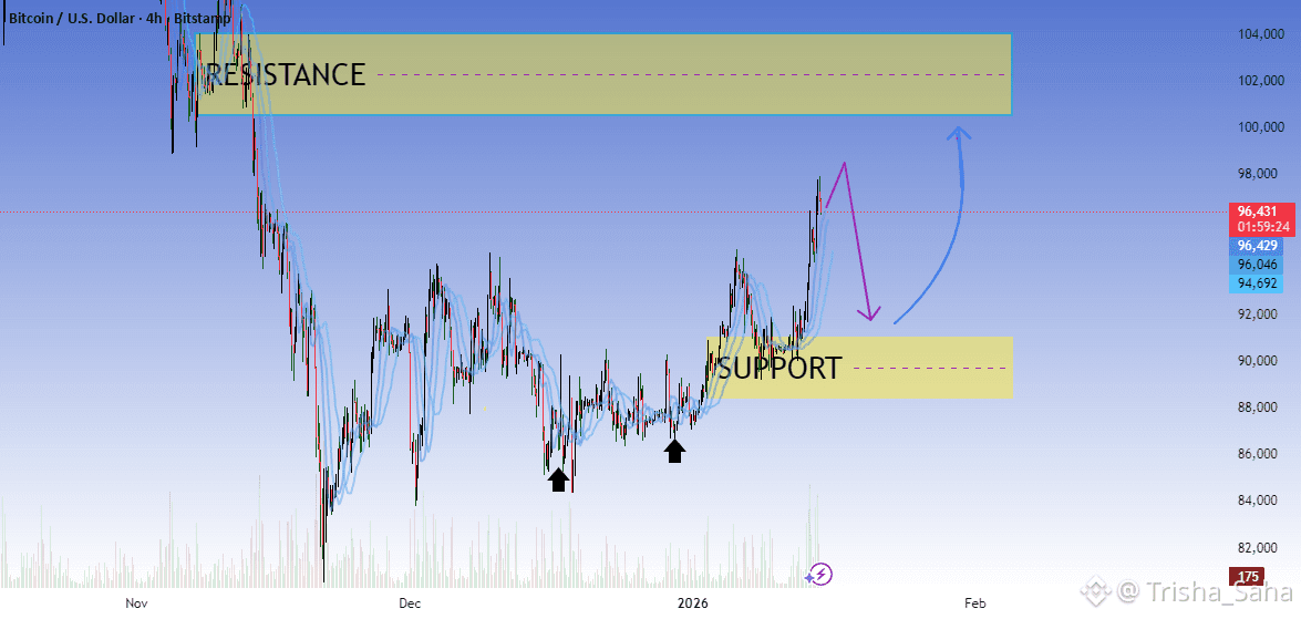 Price pushed impulsively to ~96–97k (strong bullish momentum).