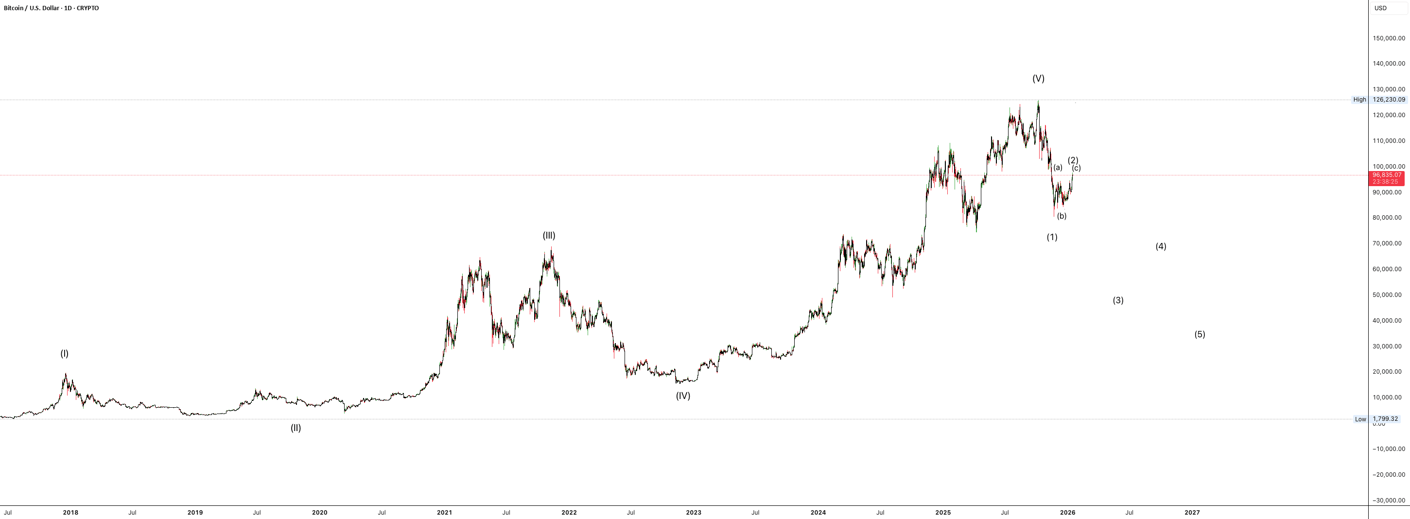 In questa tabella ho mappato la struttura impulsiva completa di Bitcoin dal 2017 al 2025 come un avanzamento a 5 onde completato. Abbiamo contrassegnato il picco (V), e ciò che si sta formando ora sembra le prime fasi di un'onda A/B/C di grado maggiore – con il (1)(2) locale già completato e un forte ribasso ancora in arrivo.