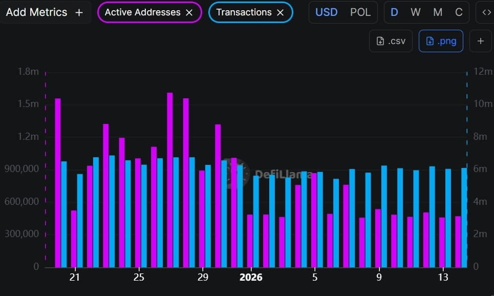 Secondo i dati divulgati da AMBCrypto, il volume di transazioni di Polygon nel 2025 ha raggiunto un record storico, con un totale di 1,4 miliardi di transazioni per l'anno. Dopo il 2026, l'attività della rete è rimasta elevata, con un volume giornaliero medio delle ultime due settimane di circa 6 milioni di transazioni.