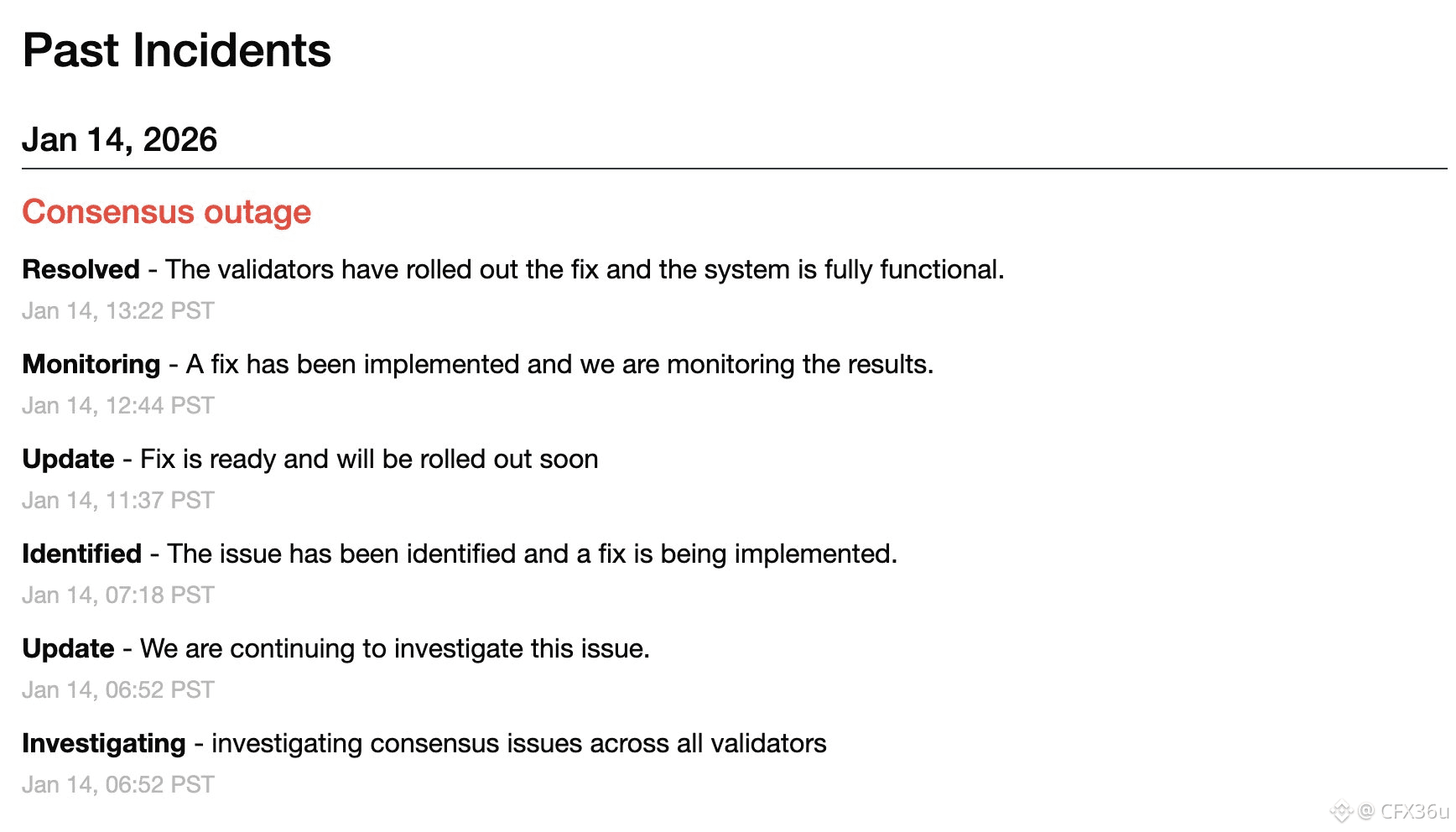 1月14日 22:52 (UTC+8):官方确认所有验证者出现共识问题,进入调查状态;