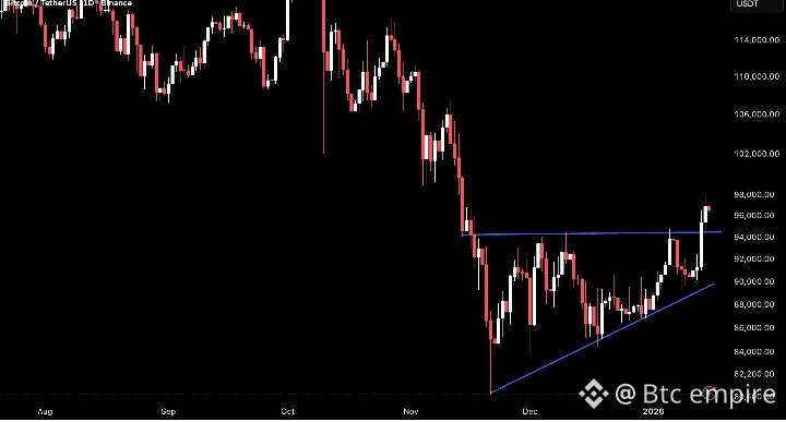 The Breakout: BTC formed "higher lows" and finally broke through the heavy $94K resistance level.