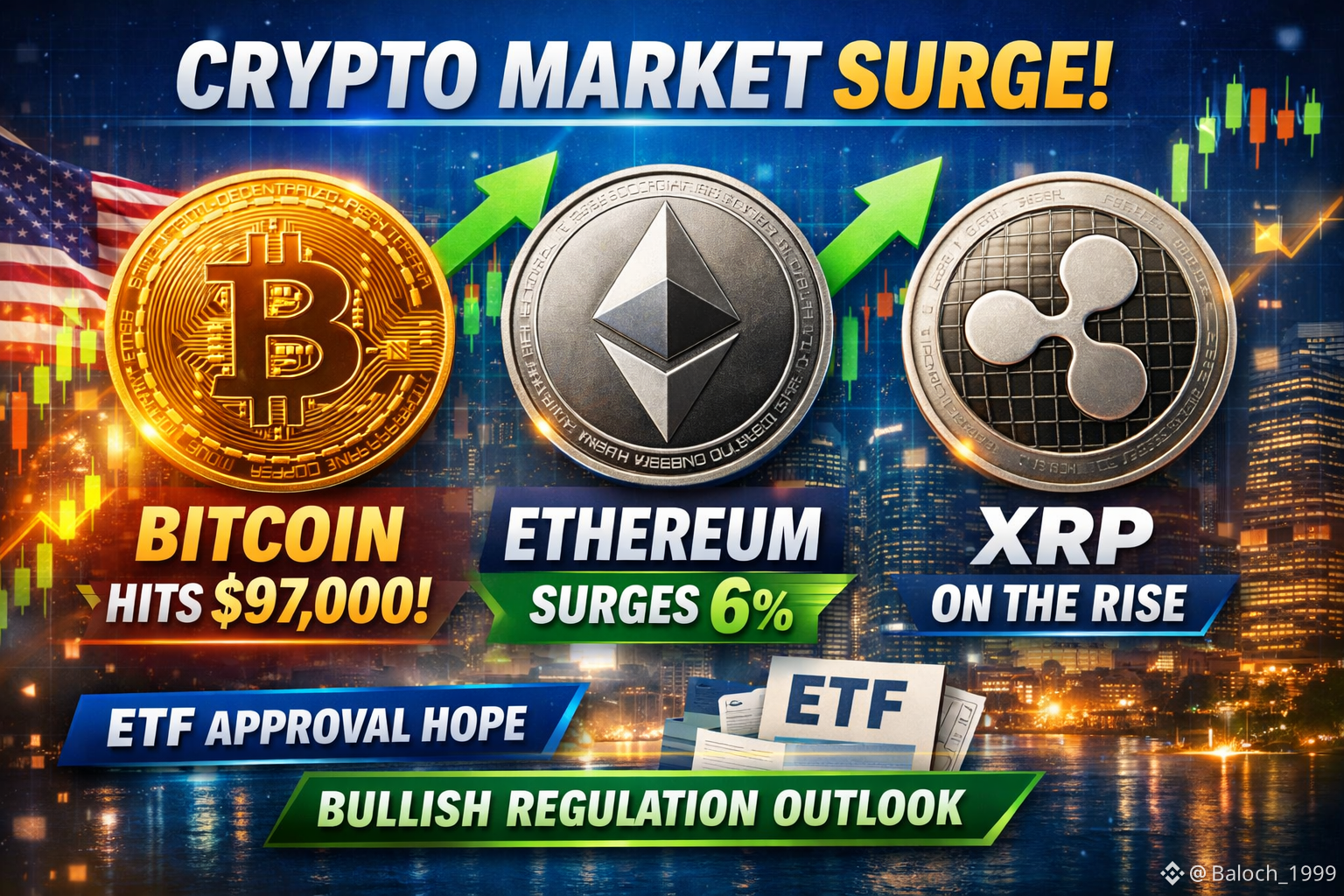 $BTC BTC surged over 3–4% and broke above key thresholds near $97K, driven by strong buying and optimistic sentiment.