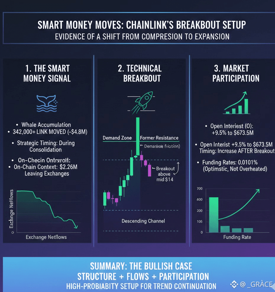 Large holders have been quietly pulling Chainlink off exchanges, and the timing tells an important story. One whale alone withdrew over 342,000 LINK worth nearly $4.8 million in just two days. This wasn’t panic buying after a big pump. It happened during consolidation and the early stages of a breakout, which usually points to planned accumulation rather than emotional chasing. When big players remove tokens from exchanges, it often signals expectation of higher prices instead of preparation to sell.
