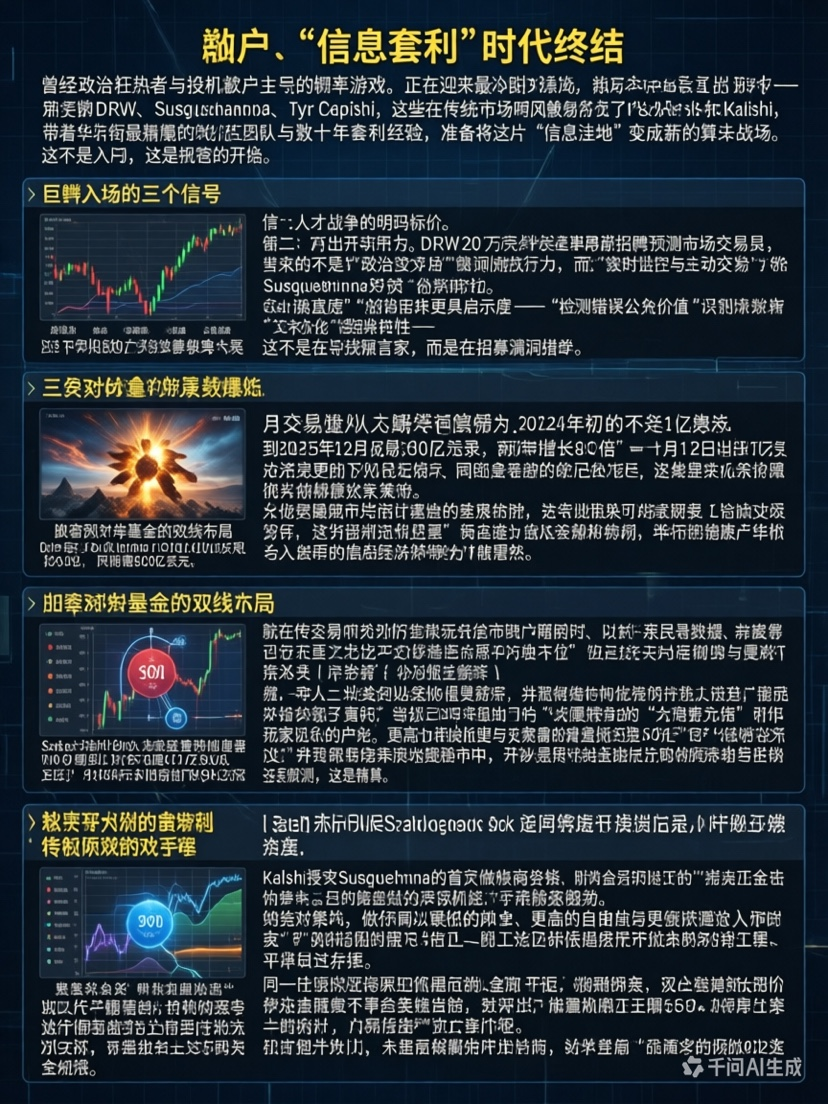 Il gioco delle probabilità, un tempo dominato da fanatici politici e da trader retail speculativi, sta ora vedendo l'arrivo dei giocatori più freddi. DRW, Susquehanna, Tyr Capital – questi giganti del trading che dominano i mercati tradizionali stanno estendendo i loro tentacoli a Polymarket e Kalshi, portando con sé i team quantitativi più agguerriti di Wall Street e decenni di esperienza nell'arbitraggio, pronti a trasformare questa "valle di informazioni" in un nuovo campo di battaglia algoritmico.