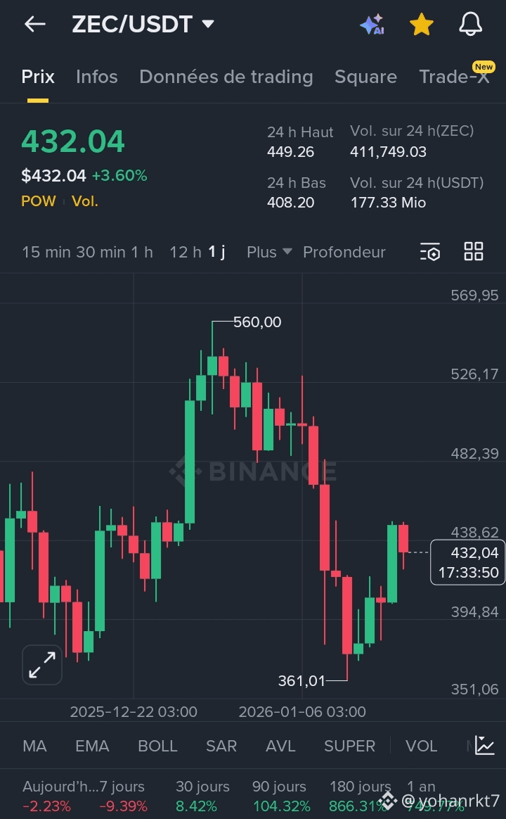 * Prix Actuel : Le ZEC s'échange à 432,04 $, affichant une hausse de +3,60 % sur les dernières 24h.