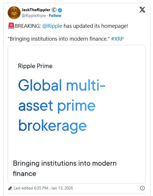 L'influencer di criptovalute JackTheRippler (@RippleXrpie) ha condiviso l'aggiornamento su X, collegando il cambiamento della homepage direttamente alla strategia istituzionale a lungo termine di Ripple intorno a XRP. La società ha messo al centro il prime brokerage. Questo posizionamento indica dove Ripple vuole che l'attenzione istituzionale si concentri man mano che si ottiene maggiore chiarezza normativa.
