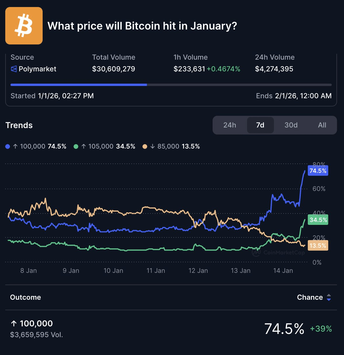 Su Polymarket, le probabilità che il Bitcoin raggiunga i 100.000 dollari prima del 31 gennaio superano ora il 74%.