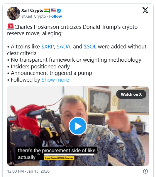 Trump ha annunciato la riserva all'inizio del 2025, poco dopo la sua insediamento. Sebbene inizialmente sia stato ben accolto, Xaif ha presentato il video come esempio di quanto sia importante il processo che sta dietro l'annuncio quanto gli asset elencati. Il suo punto era semplice. Quando le decisioni mancano di struttura, i mercati reagiscono in modi prevedibili e i partecipanti al dettaglio spesso pagano il prezzo.