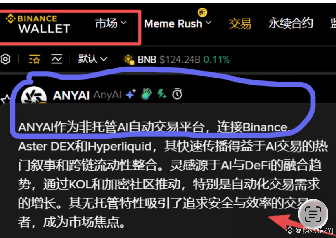 就在这样的市场分化中,(BNB Chain)上的ANYAI代币,恰好踩中了“AI+Meme”的双重热门赛道。作为主打非托管AI自动交易的项目,它不仅打通了Binance、Hyperliquid等多平台流动性,让用户无需交出资产控制权就能享受AI驱动的自动化交易策略,还依托社区传播放大话题性,完美契合当前市场对“高效工具+高热度叙事”的双重需求。