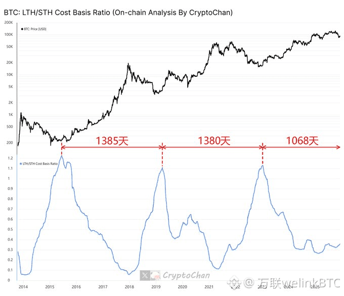 “大家看这几个高点。从2013年到2017年,再到2021年,每一轮牛市见顶的间隔,都在 1430天到1460天 之间。这简直就像时钟一样准。”