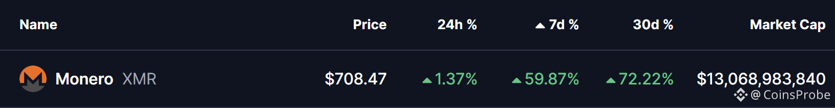 Privacy-focused cryptocurrencies are continues to stay spotlight, and momentum across the sector is rising higher. After a strong move from Zcash (ZEC), Monero (XMR) has now taken center stage by soaring 58% over the past week and 78% over the last 30 days, reflecting a sharp shift in sentiment toward privacy-preserving networks.