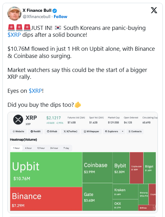 I dati di mercato evidenziati da X FINANCE BULL mostrano che gli investitori sudcoreani hanno reagito con decisione quando l'XRP ha rimbalzato. Entro un'ora, i trader hanno canalizzato circa 10,76 milioni di dollari nell'XRP su Upbit, la più grande piattaforma di asset digitali della Corea del Sud.