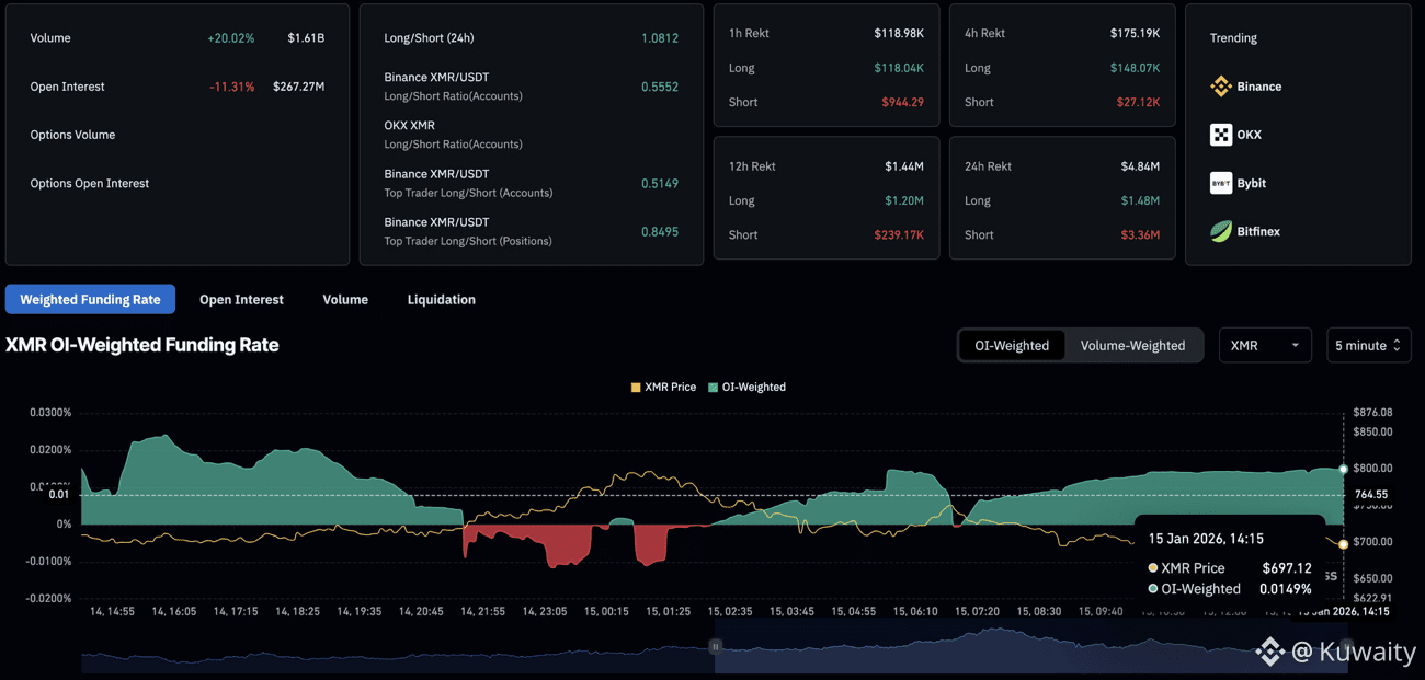 تظهر بيانات CoinGlass انخفاضًا بنسبة تزيد عن %11 في الفائدة المفتوحة لعقود XMR (OI) في آخر 24 ساعة إلى 267.27 مليون دولار - وهو انخفاض في القيمة الاسمية لجميع المراكز النشطة - مما يشير إلى انخفاض الطلب على مشتقات مونيرو حيث يقلل المتداولون من الرافعة المالية أو يغلقون المراكز.