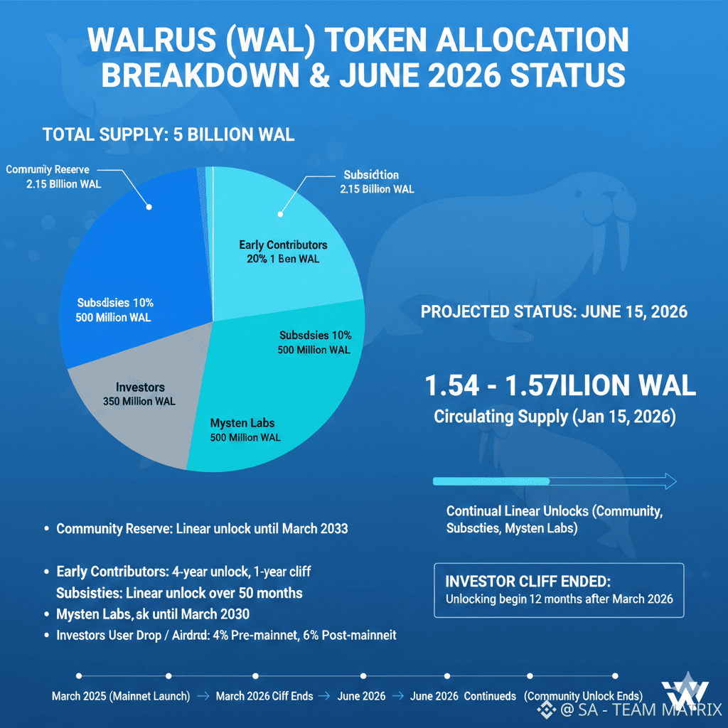 The total supply of Walrus (WAL) is fixed at 5 billion tokens. By June 15, 2026, the token allocation will be governed by a multi-year vesting schedule that began near the mainnet launch (March 2025).