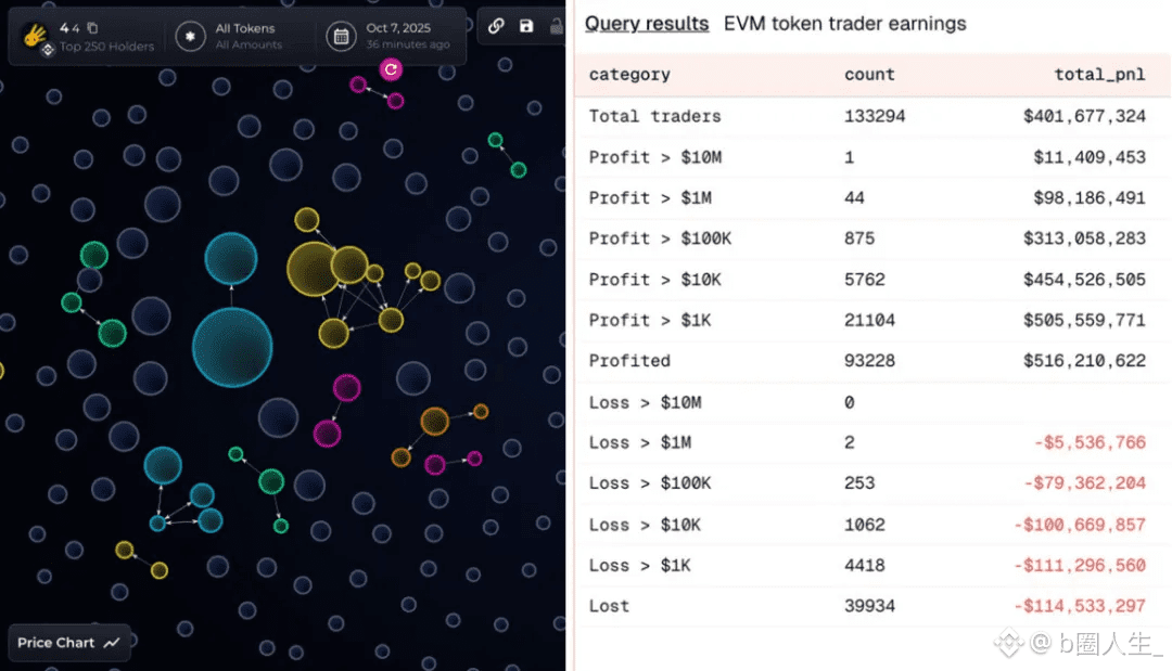 然而值得一提的是,在遍地黄金的喧嚣之下,真相远比暴富故事更为复杂。Bubblemaps的数据虽然显示70%的参与地址处于盈利状态,但财富分配极不均衡。绝大多数利润被极少数早期参与者和巨鲸赚走。对于绝大多数闻风而来的散户而言,他们面临的是一个残酷的现实:
