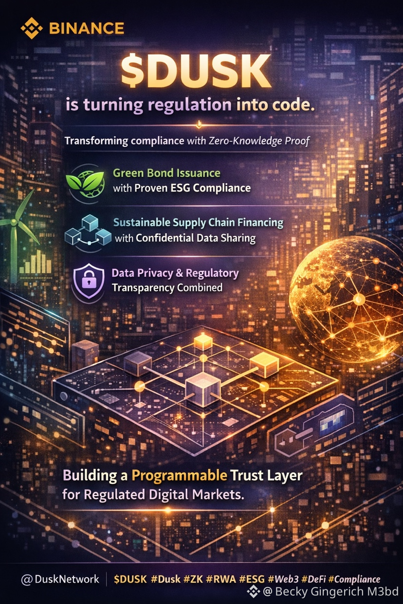 DUSK Network is transforming real-world financial compliance into executable on-chain logic. Using modular zero-knowledge proof circuits, regulatory rules like ESG standards, transaction reporting, and compliance checks can be encoded as verifiable, composable privacy components.