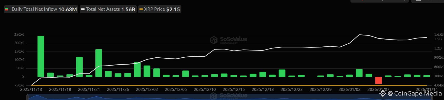 As reported by SoSoValue, U.S. spot exchange-traded funds (ETFs) recorded a net inflow of $10.63 million on January 14 (ET). According to analysts, the bullish trend might see XRP reach a short-term high of $2.15. Furthermore, in the event of increased buying pressure, the price can soar to $3 by the end of January.