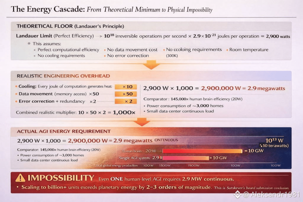 В приложенных к публикации профессионально оформленных слайдах утверждается, что AGI потребует 1018 необратимых операций в секунду. Умножив на энергию Ландауэра, авторы получают теоретический минимум 2900 Вт — в 145 раз больше энергопотребления человеческого мозга.