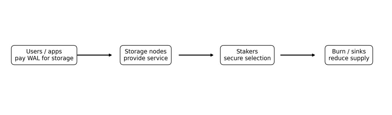 WAL si basa sul concetto di stake delegato, che richiede ai detentori di token di delegare ai nodi di archiviazione e il protocollo utilizza lo stake delegato per creare responsabilità assegnate all'archiviazione e alla sicurezza della rete.