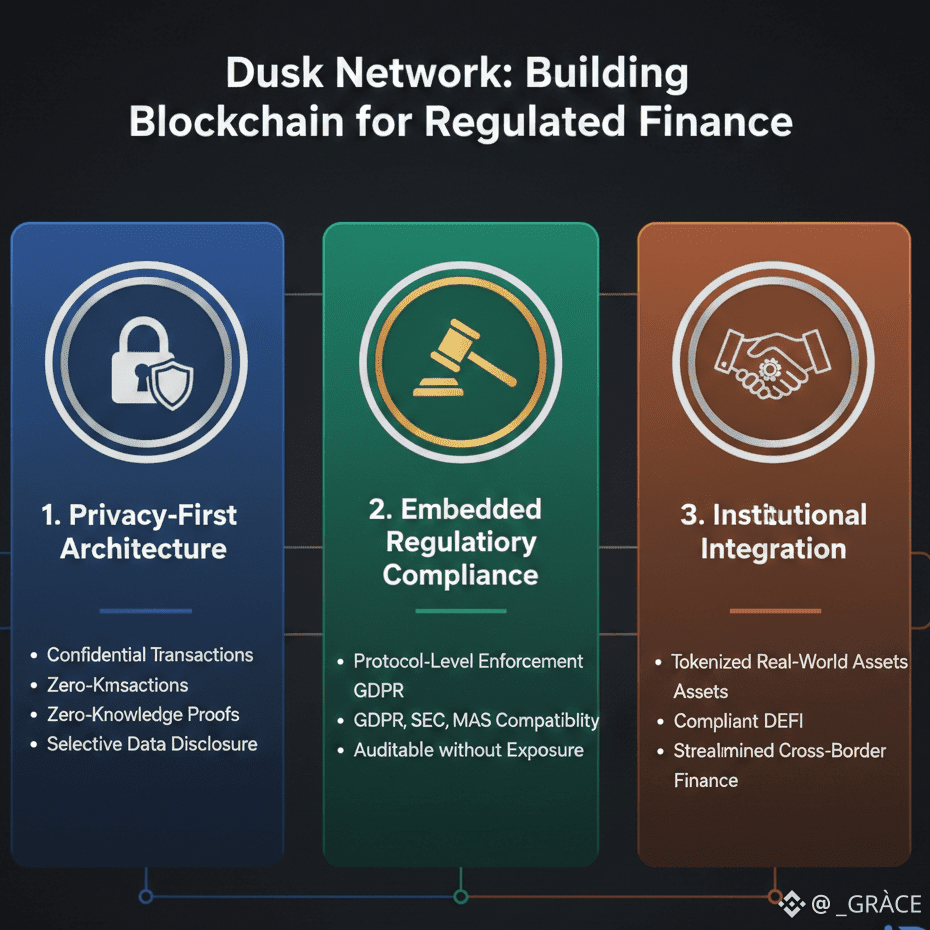 In conclusion, Dusk Network is more than just another blockchain project is a solution tailored to the realities of regulated finance. Its architecture respects privacy, enforces compliance, and ensures verifiability, creating a foundation for financial applications that cannot exist on traditional public blockchains. By aligning technology with legal and operational requirements, Dusk provides institutions with a pathway to integrate blockchain responsibly, efficiently, and securely. In doing so, it highlights a critical evolution in the blockchain space: one where innovation and regulation are not opposing forces but complementary partners in building the future of finance.