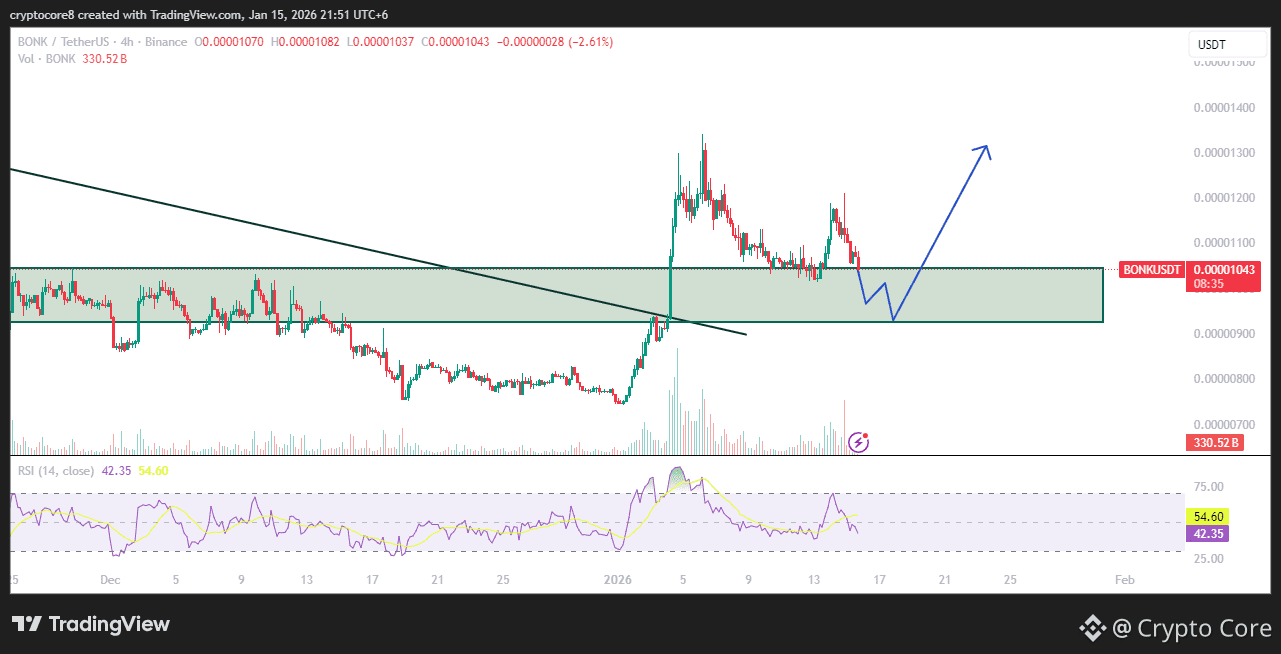 This BONKUSDT chart shows price holding strong support after a pullback. Buyers are defending the zone, and RSI is stabilising. The projected move suggests a bounce and continuation upward, signalling growing bullish momentum and a possible trend reversal ahead.