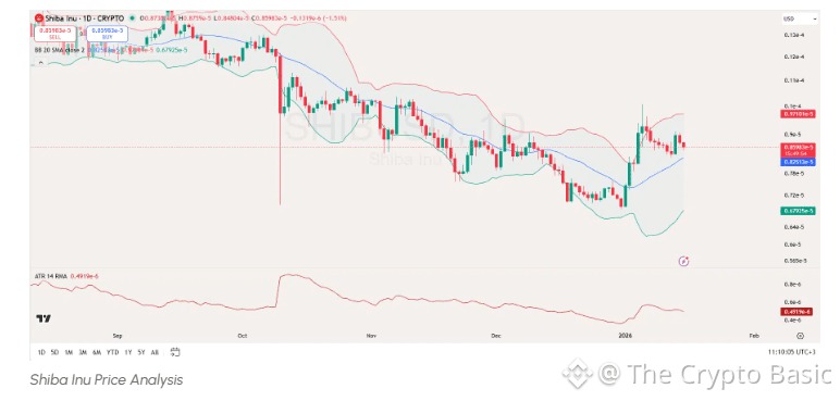 The daily chart for Shiba Inu shows the price attempting to stabilize after a prolonged downtrend. SHIB is currently trading above the middle Bollinger Band, the 20-day SMA, which often acts as a short-term equilibrium zone.
