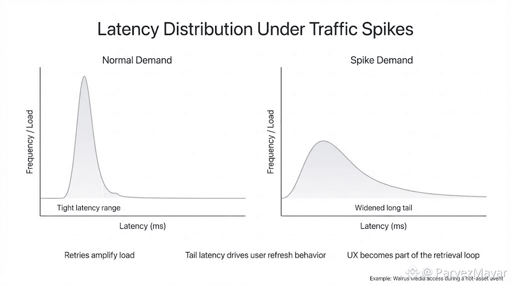 "there' isn't a single origin with a global front door. It's storage nodes serving slivers... plus whatever retrieval path your users hit through gateways and backends you control (or don't). Under a spike the system does not fail like a database. It fails like bandwidth. Same asset... same few minutes too many concurrent reads and suddenly the bottleneck isn't your app code or your contract logic. It is egress. Pipes. Cold disks. The stuff nobody puts on the mint page.